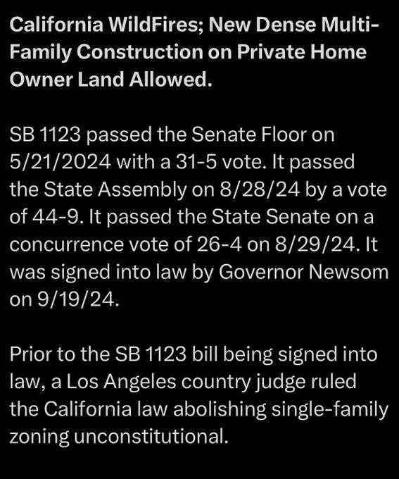 This law was already on the books when the fires hit. It was passed in 2024. Then, the fires took care of much of the rest. Those victims of their own government may find that developers are constructing multi-family residences where once there were beautiful homes . This may or may not be found to be unconstitutional but the bill seems to have become law nonetheless.